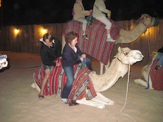 Riding a camel is not as comfortable as one might hope. Perhaps for longer camel treks than my 35 seconds (literally) they give you more padding and support. I've got to say that while I was hoping for more of a camel ride, I'm glad this one didn't last much longer. The desert safari includes a "camel ride," (+/- 30 seconds, something they don't tell you in the brochure) at the place where you eat your barbecue. Katja and I were safariing with two Germans, and Katja and the lady German weren't interested in the camels, so it was me and the German dude. We got on the camel, who was perched in the ground with his legs folded under him. Then were told to hold on tight and lean back as far as we could. I experienced a moment of terror as the camel got up onto its hooves-- there's a lot of rocking and rolling that goes on when a camel gets up! I totally thought I'd go flying, but the German and I managed to hold on. I think we both realized the degree of uncomfort right about the same time.